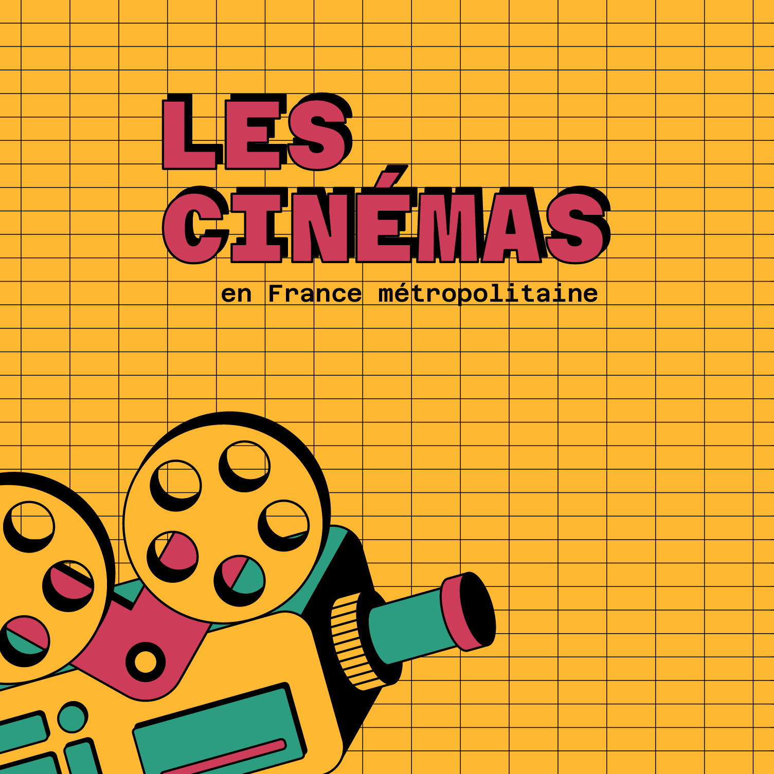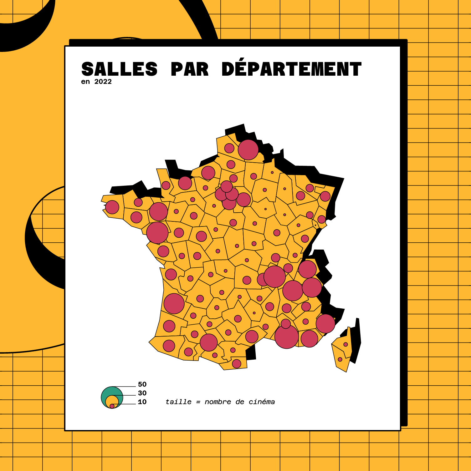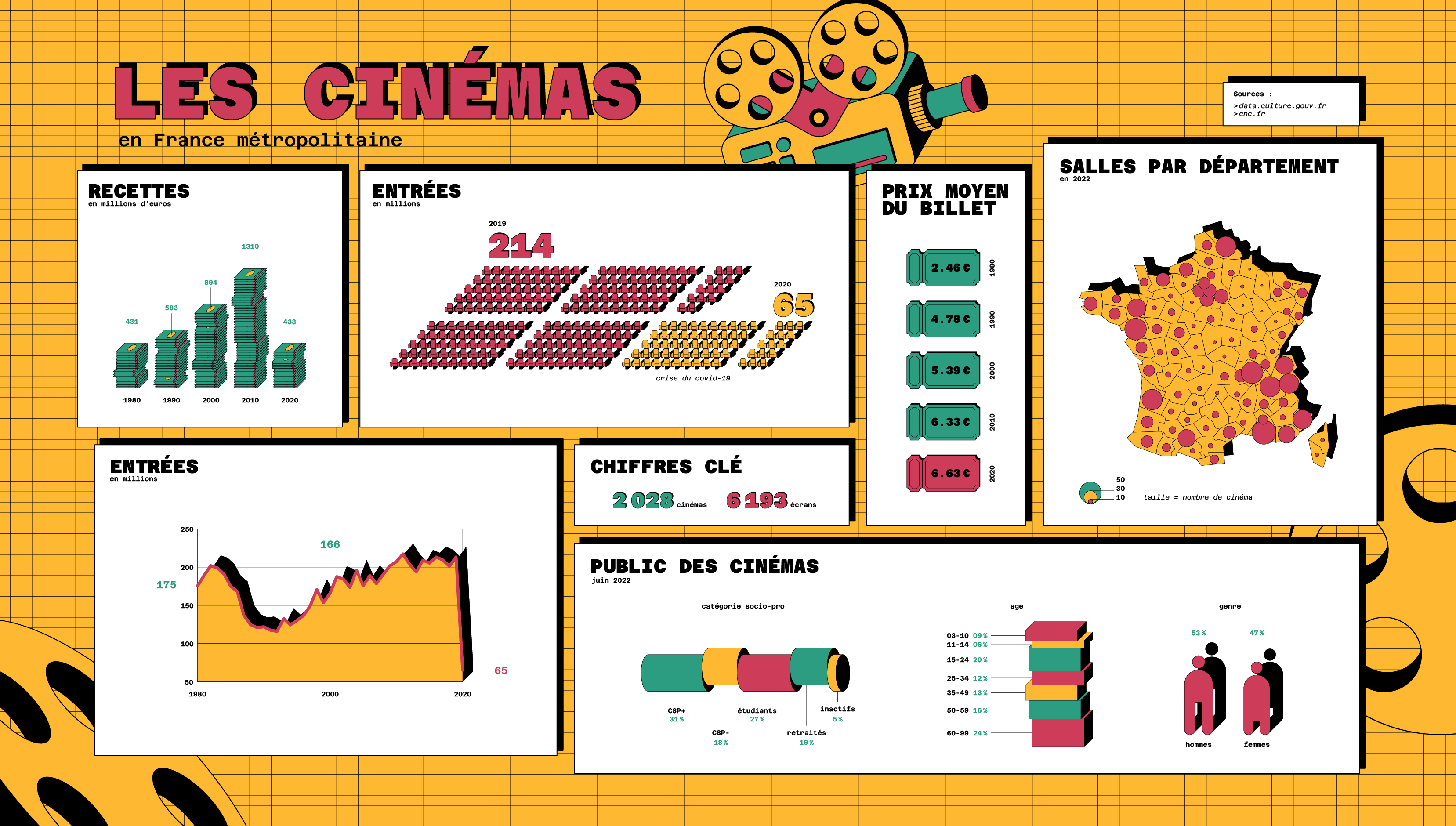 Dataviz sur l'évolution des salles de cinéma en France métropolitaine. Design par Pierre-Marie BAGOT