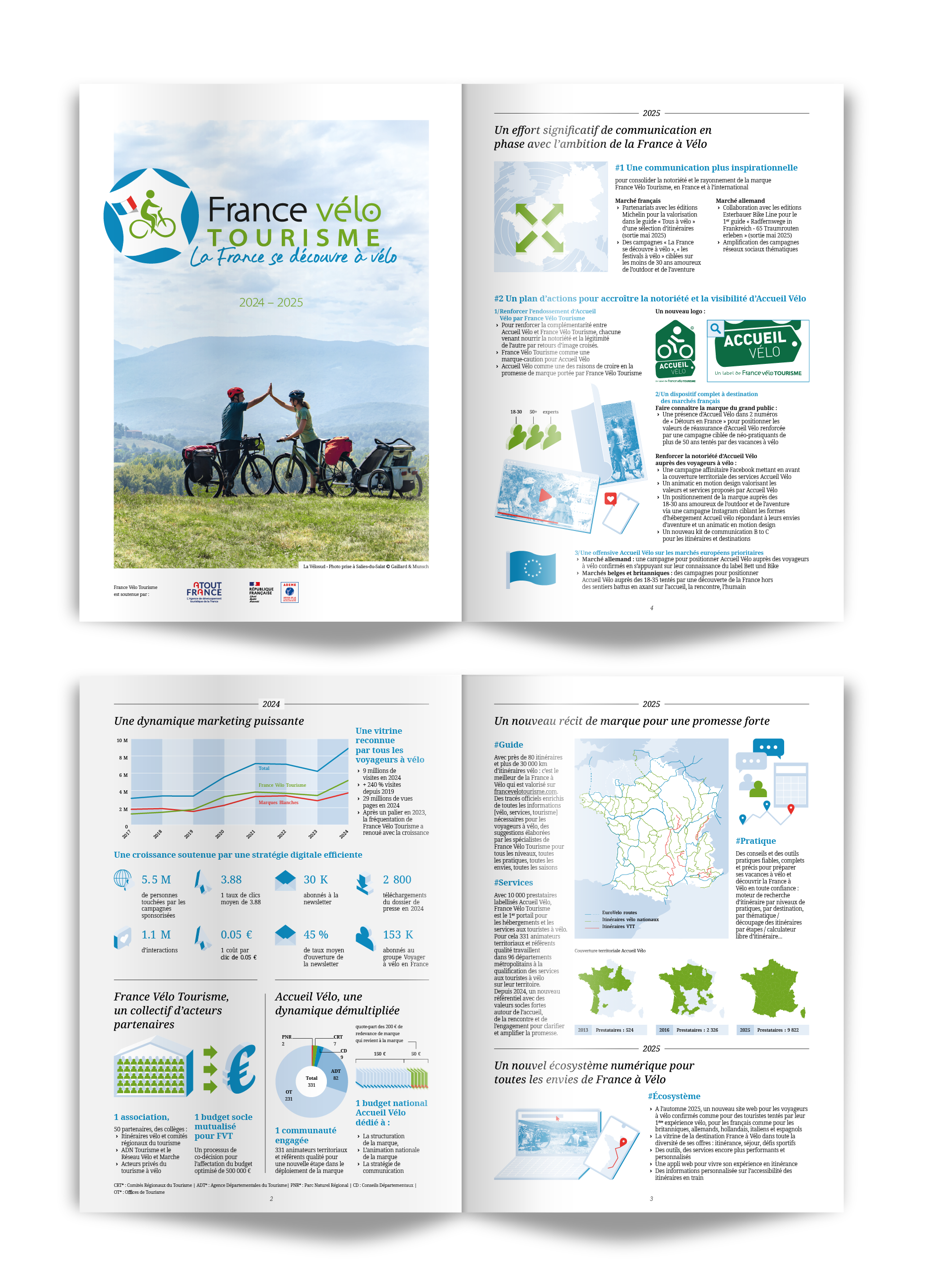 Infographie visant à souligner l'influence et la renommée de l'association France Vélo Tourisme. L'objectif de ce livret de 4 pages est de positionner FVT comme la référence incontournable pour les passionnés de vélo ainsi que pour les professionnels du tourisme.