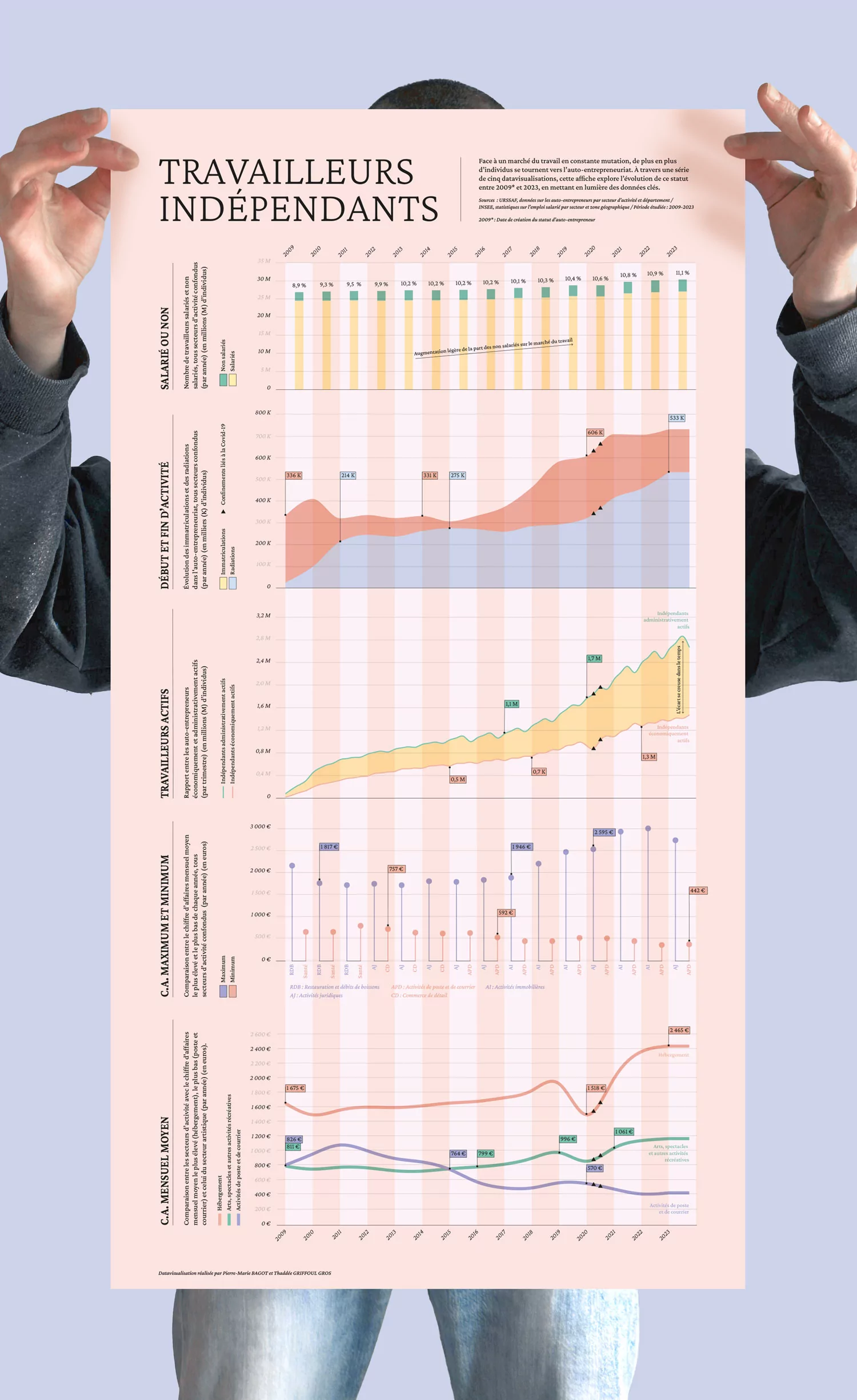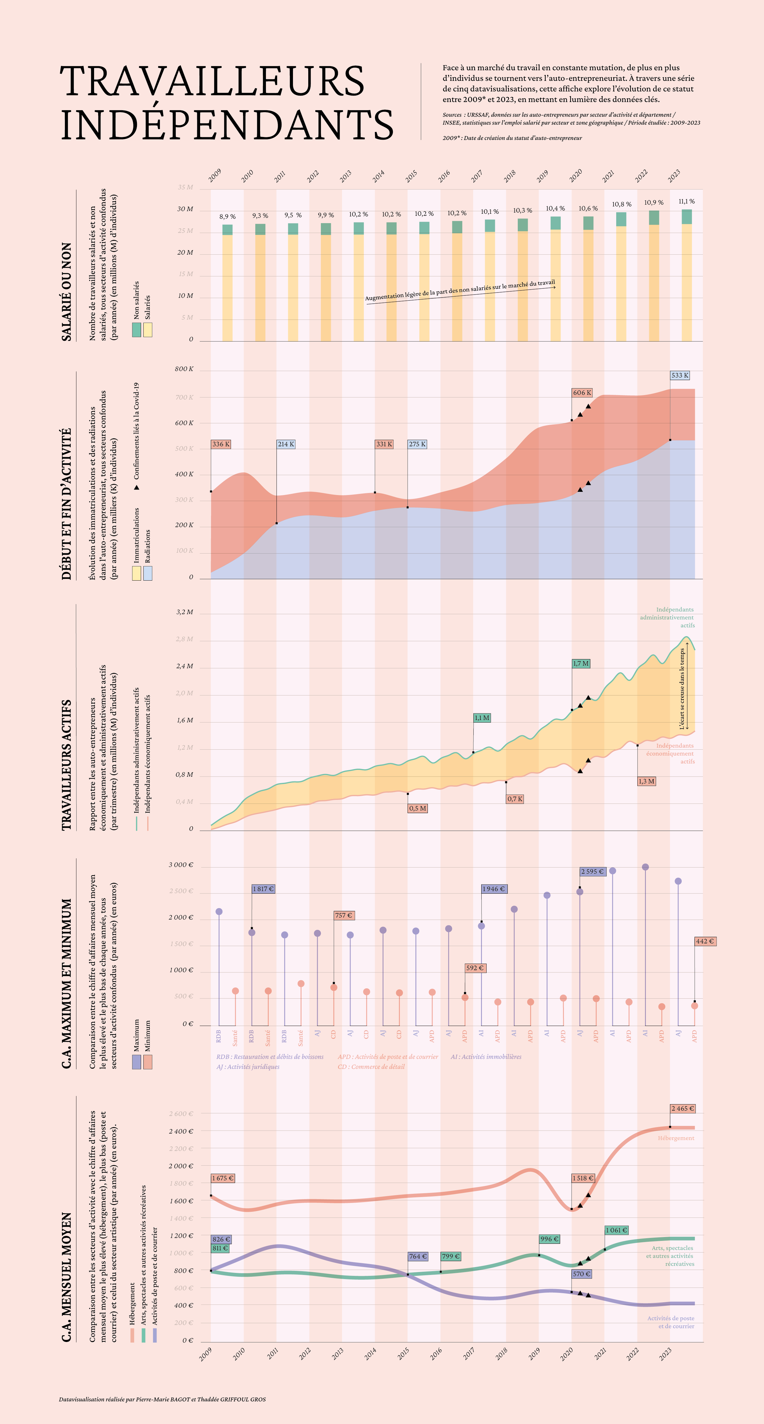 Face à un marché du travail en constante mutation, de plus en plus d’individus se tournent vers l’auto-entrepreneuriat. À travers une série de cinq datavisualisations, cette affiche explore l’évolution de ce statut entre 2009 et 2023, en mettant en lumière des données clés.