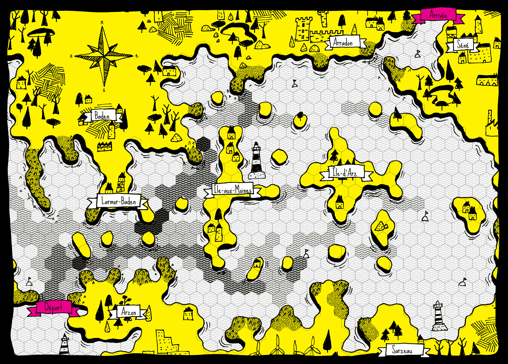 Design graphique du jeu de société GOLF DREAM Ce jeu est une course ou le but est de remonter les eaux du golfe du Morbihan tout en piégeant ses adversaires afin d'être le premier à l'arrivée.